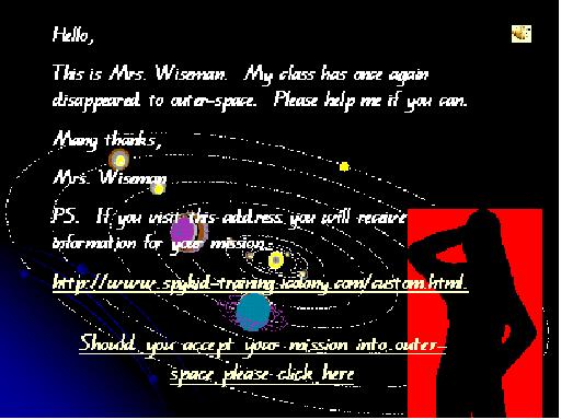 Central to the students learning was this story, presented on power point, about a class that were dancing on a sunbeam. The sunbeam caught the class up by the heals and hurled them into Space. The story ended with a letter from the teacher asking for our help to rescue the class. There were links to internet sites as part of this letter and ideas for learning about Space. |