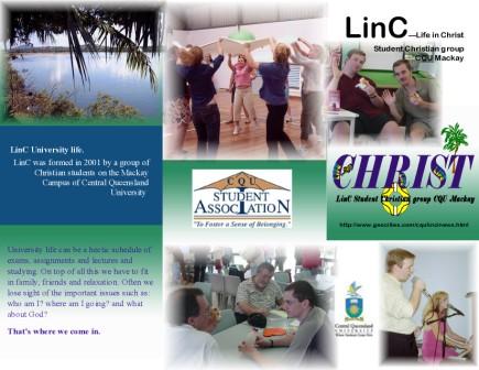 2005 - President of the University Student Christian group, LinC - Life in Christ. As the president of the Student Christian Group, LinC, in 2005, I created this brochure.... this is just one side of the brochure. |